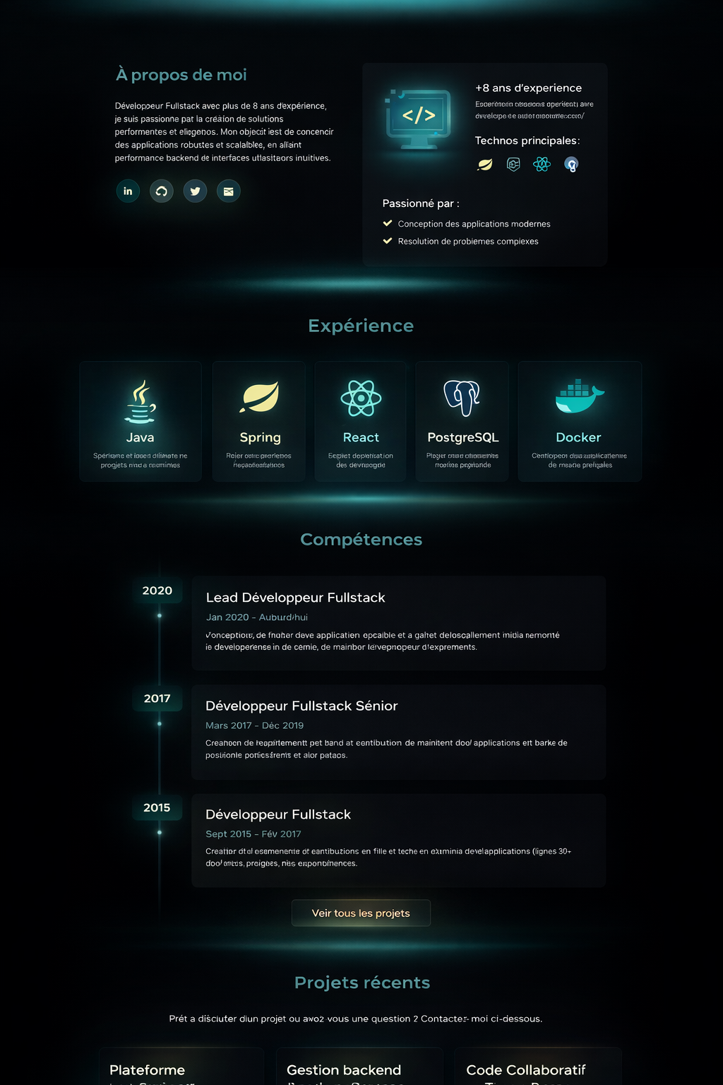 Développeur Fullstack avec plus de 8 ans d’expérience, spécialisé en Java / Spring et React. J'aime créer des applications web performantes et évolutives qui offrent une excellente expérience utilisateur. Avec plusieurs années d'expérience dans le développement logiciel, je suis toujours à la recherche de nouveaux défis et opportunités pour apprendre et grandir.